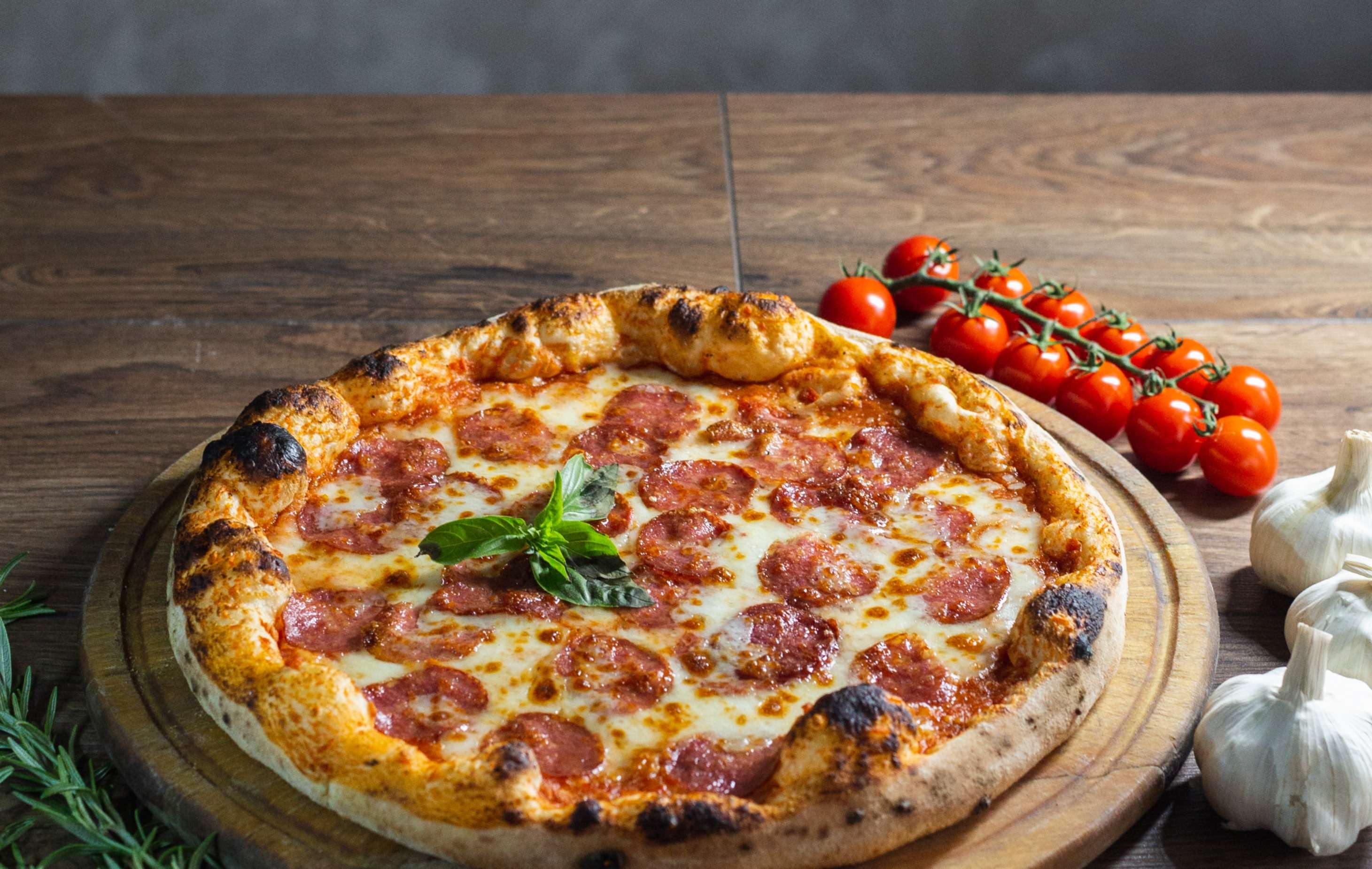 tomatensaus, kaas, paprika, ui, champignons, pesto, olijven,, parmezaanse kaas, rucola en pijnboompitten